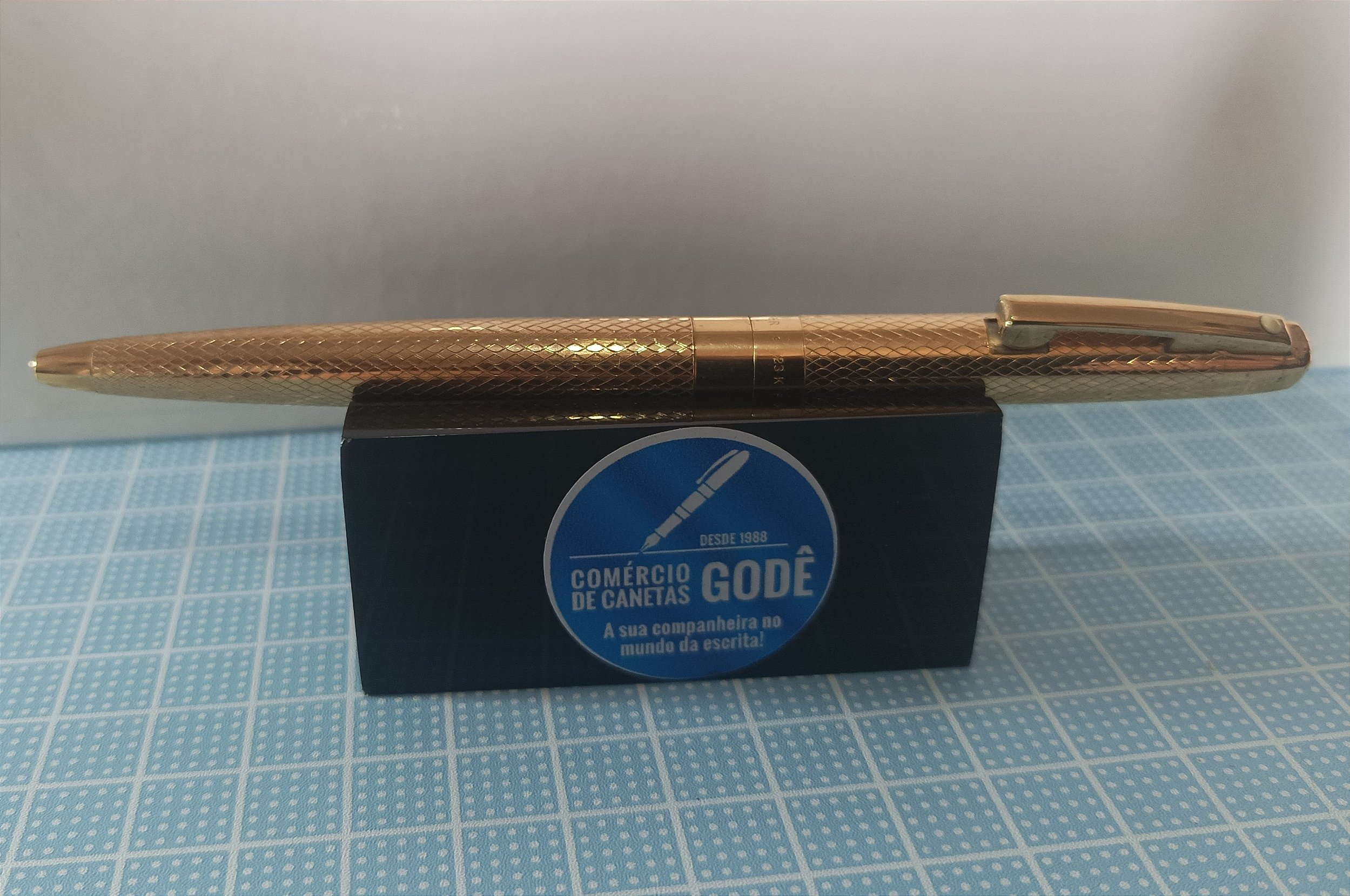 A Caneta Esferográfica Sheaffer 500 tem como principal característica o seu clip denominado de “Safe Click" que impede que a pessoa guarde sua caneta no bolso da camisa ou do paletó com ele acionado, é um ótimo presente para que trabalhe em escritórios ou precise de uma caneta para reuniões, seu corpo é folheado a ouro 23 K e tem seu período histórico entre 1969 até 1977, mede 126 mm de comprimento e 9 mm de largura, teve uma revisão recente em nossa oficina e está em perfeitas condições de uso, a carga esferográfica é nova e está dentro das especificações das cargas para este modelo. .